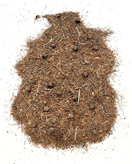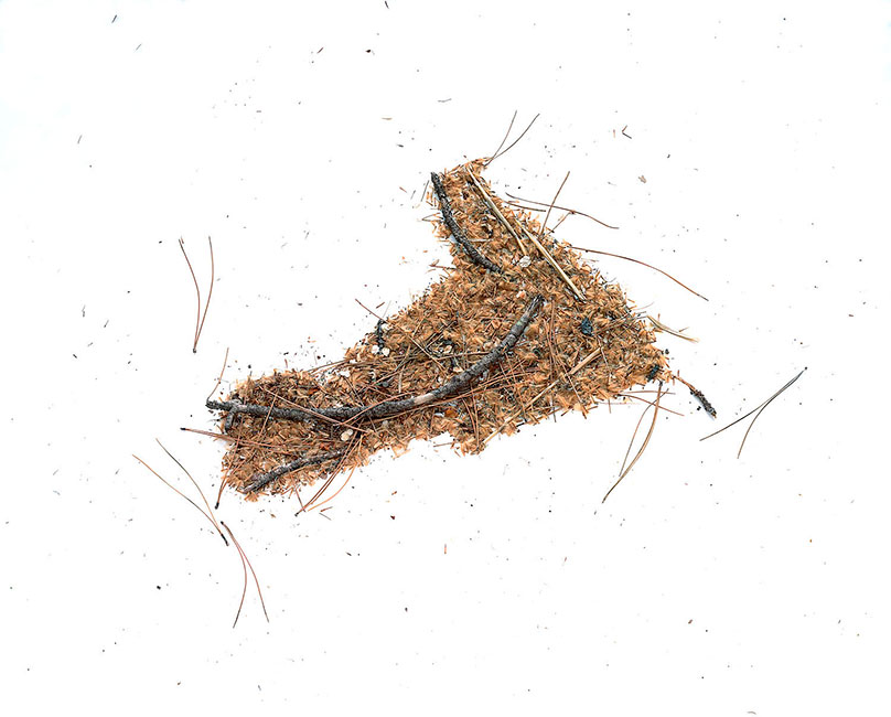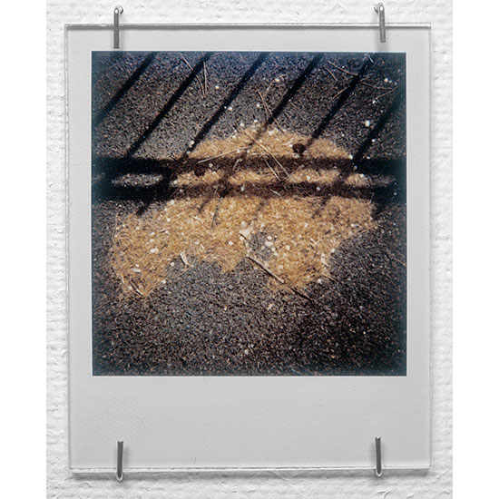During the spring of 2002 I began noticing interesting clusters of leaves, seeds, pine needles, and other plant detritus on the driveway between my apartment building and the garage. Every day there were new additions to the piles as their formations constantly changed. The small Polaroid prints are documents of the way that I found the plant material on the sidewalks and streets. They capture the way they looked when I stumbled upon them, before I scooped them up and sealed them into ziplock bags to bring to my studio. Later the Polaroid prints served as the points of reference in the re-formation of the shapes on my studio floor to be re-photographed, and then, once again, reassembled directly on the floor of a gallery. The dialogue that takes place between the Polaroid prints, Iris prints, and the rearrangement of the actual material in this body of work, at the time, was the latest point of departure in my practice—the intersection of documentary photography and installation strategies. My goal was to preserve the original formation of the plant detritus throughout the entire exhibition; however, it soon became apparent that the various incarnations of the piles were far more different at each stage than they were the same. Unlike photographic reproduction, where nearly identical copies can be endlessly produced, it was impossible to piece back such a complex puzzle, such a chaotic distribution of matter. Attempting such a task heightened my appreciation for chance occurrences, while at the same time fulfilling my desire to create an illusion of control over the materials that may very well be in control of us.